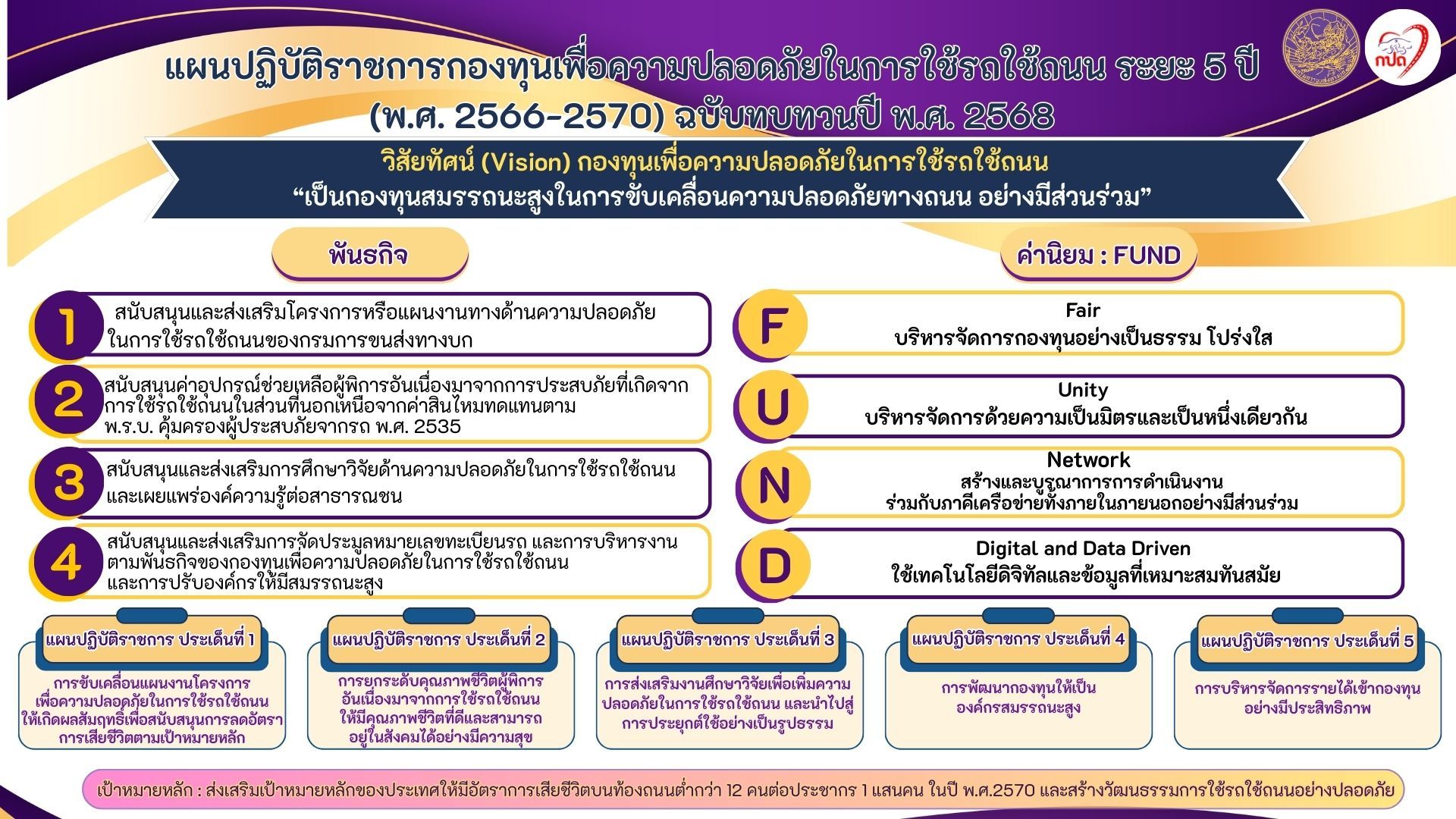 << ดาวน์โหลด>> แผนปฏิบัติราชการ กองทุนเพื่อความปลอดภัยในการใช้รถใช้ถนน ระยะ 5 ปี ฉบับทบทวน w.ศ. 2568 >>